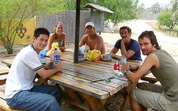 gemeinsames Frühstück in Maun (Dave, Tanja, Ian, Jared)
