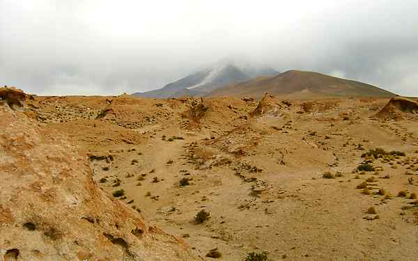 bizarre Landschaft mit Vulkan Ollague im Hintergrund
